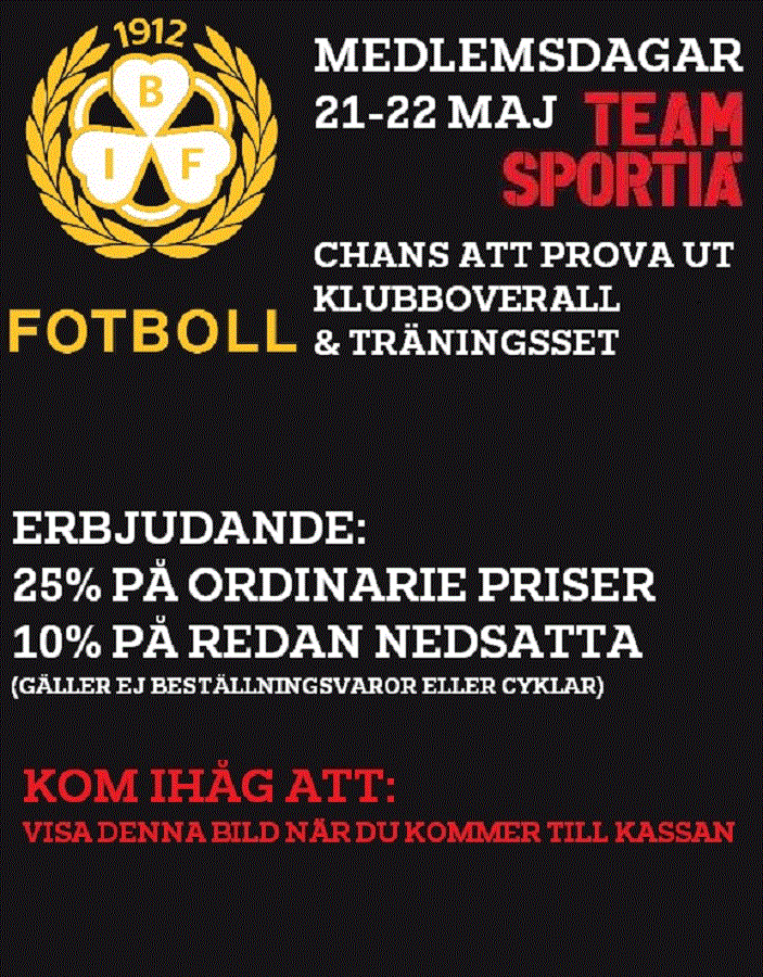 Medlemsdagar på Team Sportia i Gävle 21 och 22 maj för dig som är spelare/medlem i Brynäs IF FK. Här kan du handla dina fotbollsgrejor samt beställa overall och träningsset med Brynäslogga. Kom ihåg att ta med bilden!! Brynäs IF Fotboll 17 maj 2018